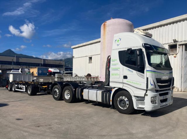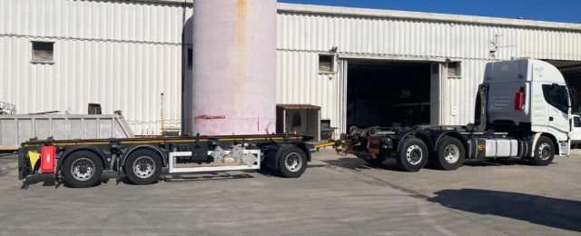 Cabina XP Active Space con sospensioni pneumatiche, Motore Cursor 13, 510 hp Emissioni di Scarico Euro 6, Cambio manuale ZF, 16 marce, frigorifero, aria condizionata e we basto, Climatizzatore da fermo, Passo 4200 mm, Retarder, ADR totale, Impianto scarrabile BOB IT 26 per casse da 6200 mm, con bloccaggio anteriore e posteriore, Brandeggio. Anno di immatricolazione: 11/2018, portata: 13.700 kg, rimorchio Roagna 3 assi con scarrabile per casse da 7,20, passo 4800 mm, Portata: 21.150 kg